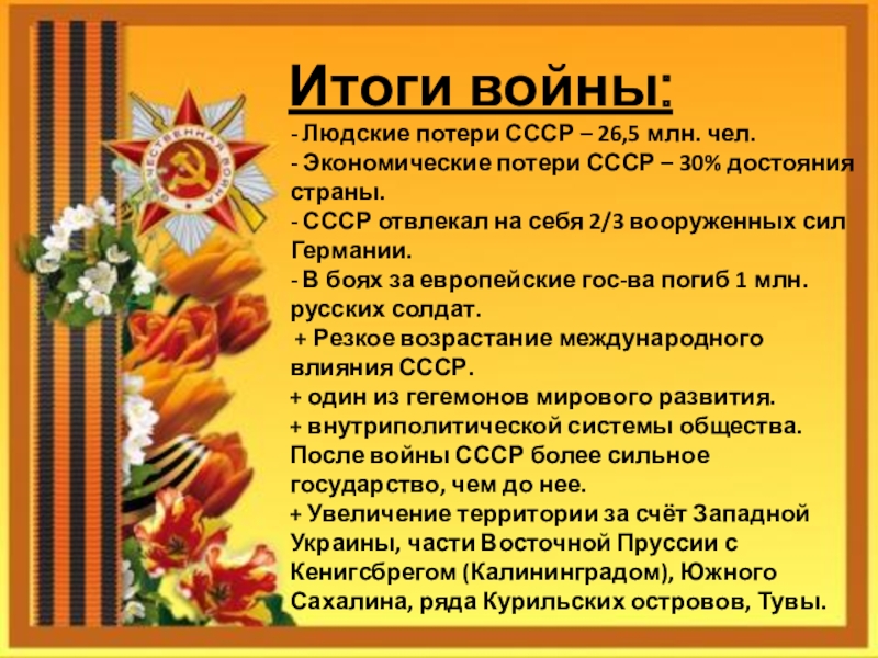 + Увеличение территории за счёт Западной Украины, части Восточной Пруссии с Кенигсбрегом (Калининградом), Южного Сахалина, ряда Курильских островов, Тувы.