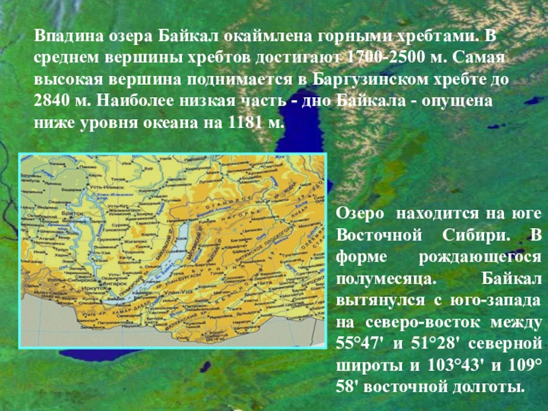 Впадина озера Байкал окаймлена горными хребтами. В среднем вершины хребтов достигают 1700-2500 м. Самая высокая вершина поднимается в Баргузинском хребте до 2840 м. Наиболее низкая часть - дно Байкала - опущена ниже уровня океана на 1181 м.