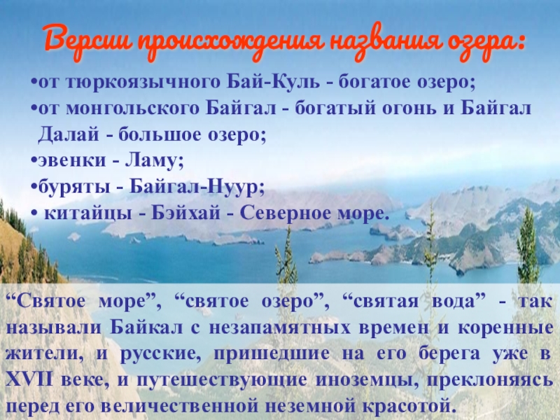 “Святое море”, “святое озеро”, “святая вода” - так называли Байкал с незапамятных времен и коренные жители, и русские, пришедшие на его берега уже в XVII веке, и путешествующие иноземцы, преклоняясь перед его величественной неземной красотой.