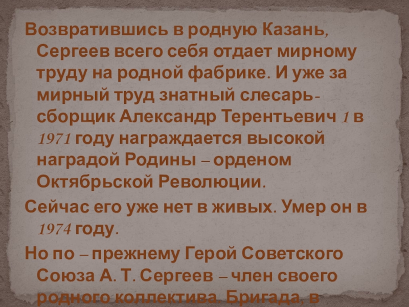 Но по – прежнему Герой Советского Союза А. Т. Сергеев – член своего родного коллектива. Бригада, в которой трудился А. Т. Сергеев, носит его имя. Деньги, заработанные на его имя, она вносит в фонд мира.