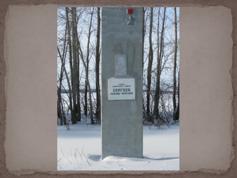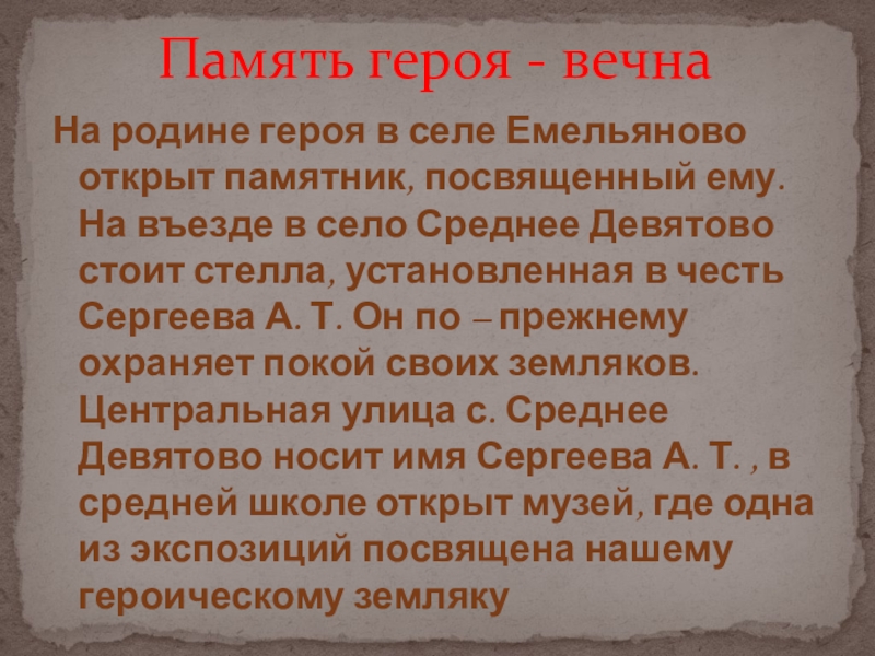 Слайд 15На родине героя в селе Емельяново открыт памятник, посвященный ему. На