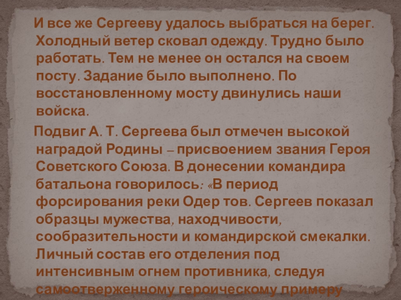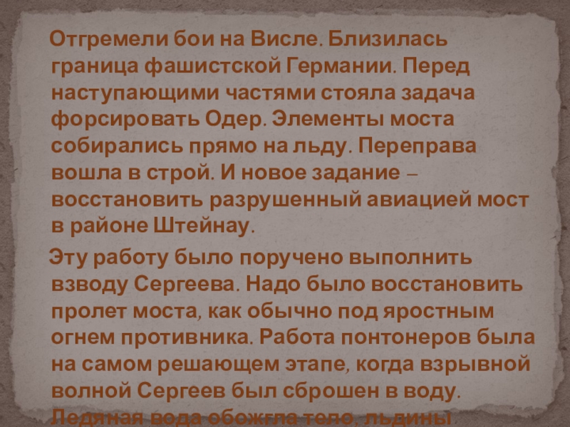 ветер сковал одежду. Трудно было работать. Тем не менее он остался на своем посту. Задание было выполнено. По восстановленному мосту двинулись наши войска.