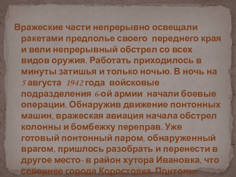 непрерывный обстрел со всех видов оружия. Работать приходилось в минуты затишья и только ночью. В ночь на 5 августа 1942 года войсковые подразделения 6-ой армии начали боевые операции. Обнаружив движение понтонных машин, вражеская авиация начала обстрел колонны и бомбежку переправ. Уже готовый понтонный паром, обнаруженный врагом, пришлось разобрать и перенести в другое место- в район хутора Ивановка, что севернее города Коростояка. Понтоны перетаскивали на руках.