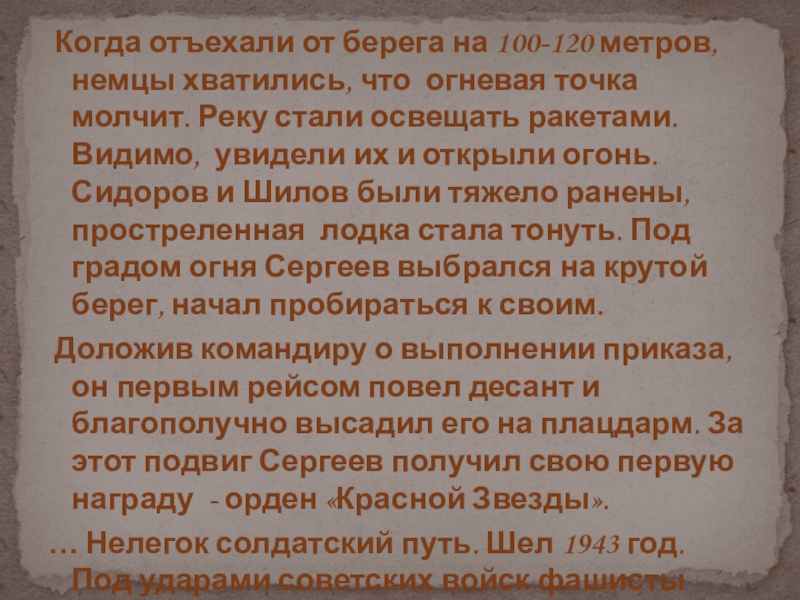 огневая точка молчит. Реку стали освещать ракетами. Видимо, увидели их и открыли огонь. Сидоров и Шилов были тяжело ранены, простреленная лодка стала тонуть. Под градом огня Сергеев выбрался на крутой берег, начал пробираться к своим.
