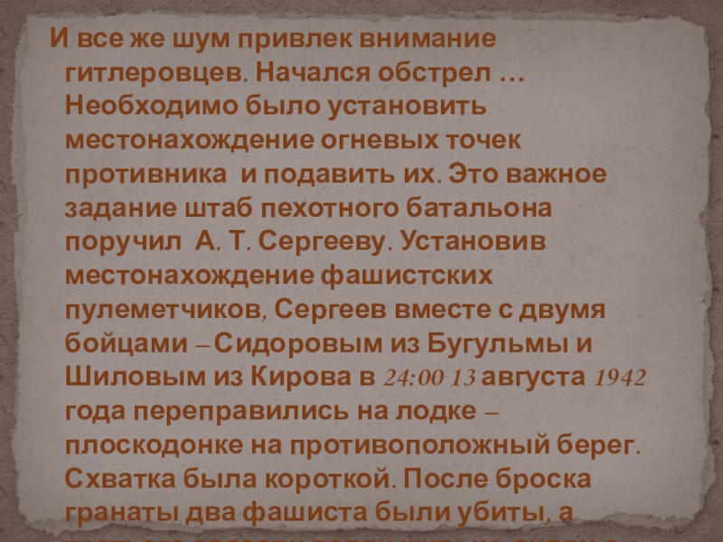 Необходимо было установить местонахождение огневых точек противника и подавить их. Это важное задание штаб пехотного батальона поручил А. Т. Сергееву. Установив местонахождение фашистских пулеметчиков, Сергеев вместе с двумя бойцами – Сидоровым из Бугульмы и Шиловым из Кирова в 24:00 13 августа 1942 года переправились на лодке – плоскодонке на противоположный берег. Схватка была короткой. После броска гранаты два фашиста были убиты, а третьего связали взяли живым, сняли с пулемета затвор , в ствол набили земли и осторожно отправились обратно.