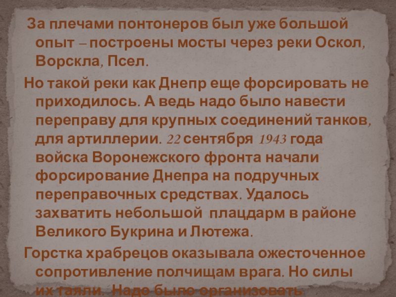 Но такой реки как Днепр еще форсировать не приходилось. А ведь надо было навести переправу для крупных соединений танков, для артиллерии. 22 сентября 1943 года войска Воронежского фронта начали форсирование Днепра на подручных переправочных средствах. Удалось захватить небольшой плацдарм в районе Великого Букрина и Лютежа.