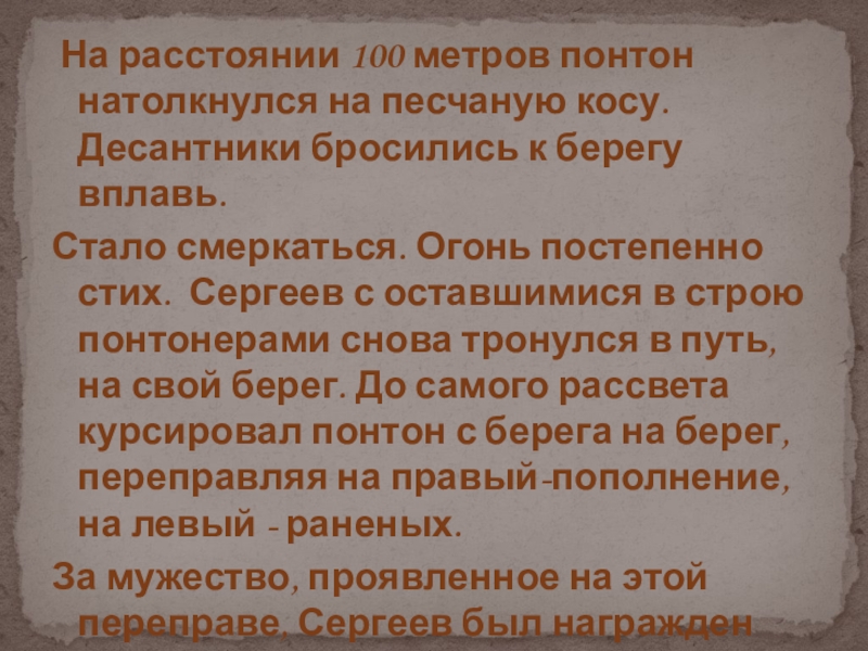 Слайд 11 На расстоянии 100 метров понтон натолкнулся на песчаную косу. Десантники