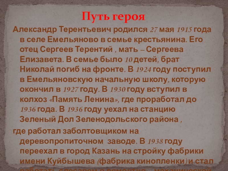 Слайд 5Александр Терентьевич родился 27 мая 1915 года в селе Емельяново в
