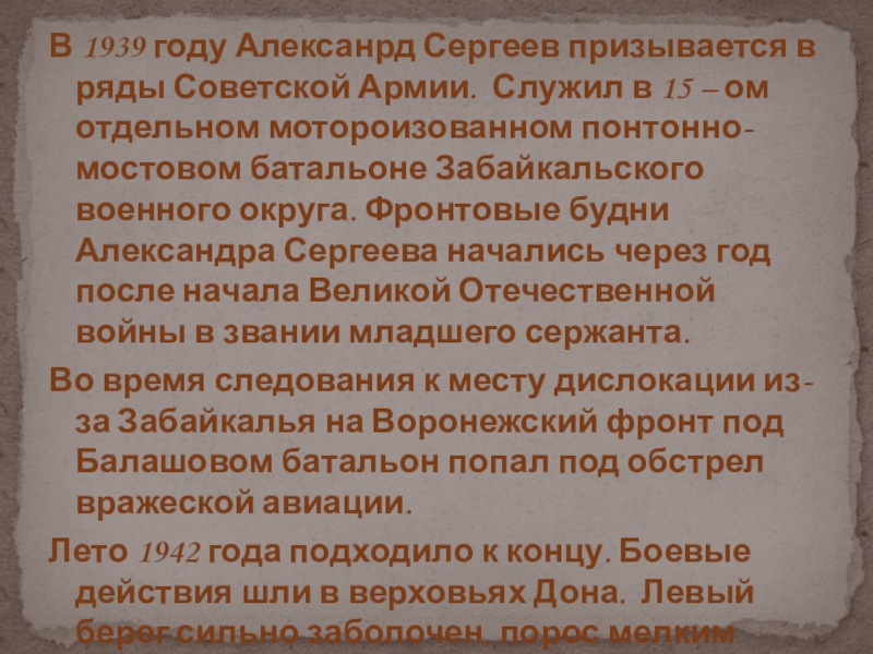 Слайд 6В 1939 году Алексанрд Сергеев призывается в ряды Советской Армии. Служил