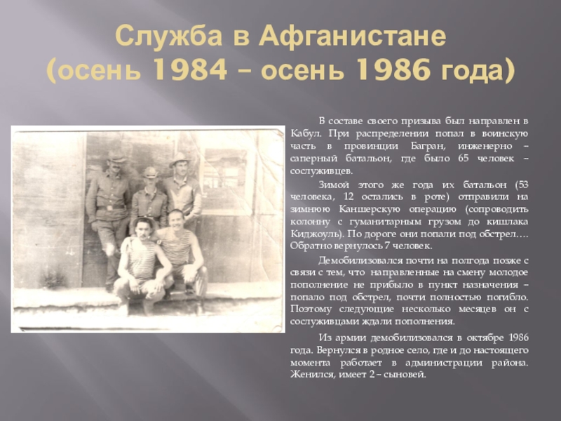 призыва был направлен в Кабул. При распределении попал в воинскую часть в провинции Багран, инженерно – саперный батальон, где было 65 человек – сослуживцев.