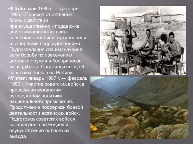 IV этап: январь 1987 г. — февраль 1989 г. Участие советских войск в проведении афганским руководством политики национального примирения. Продолжение поддержки боевой деятельности афганских войск. Подготовка советских войск к возвращению на Родину и осуществление полного их вывода.