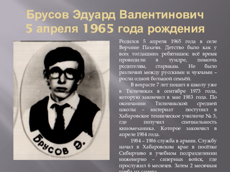 в селе Верхние Пахачи. Детство было как у всех тогдашних ребятишек: всё время проводили в тундре, помощь родителям, старикам. Не было различий между русскими и чукчами – росли одной большой семьёй.