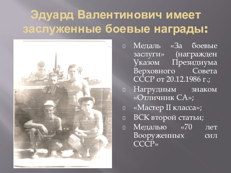 Слайд 14Эдуард Валентинович имеет заслуженные боевые награды:
