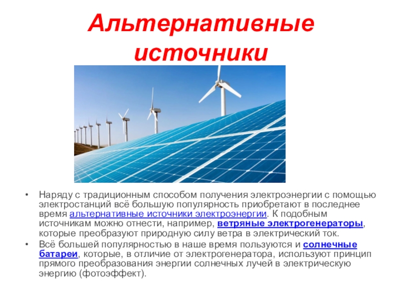 Всё большей популярностью в наше время пользуются и солнечные батареи, которые, в отличие от электрогенератора, используют принцип прямого преобразования энергии солнечных лучей в электрическую энергию (фотоэффект).