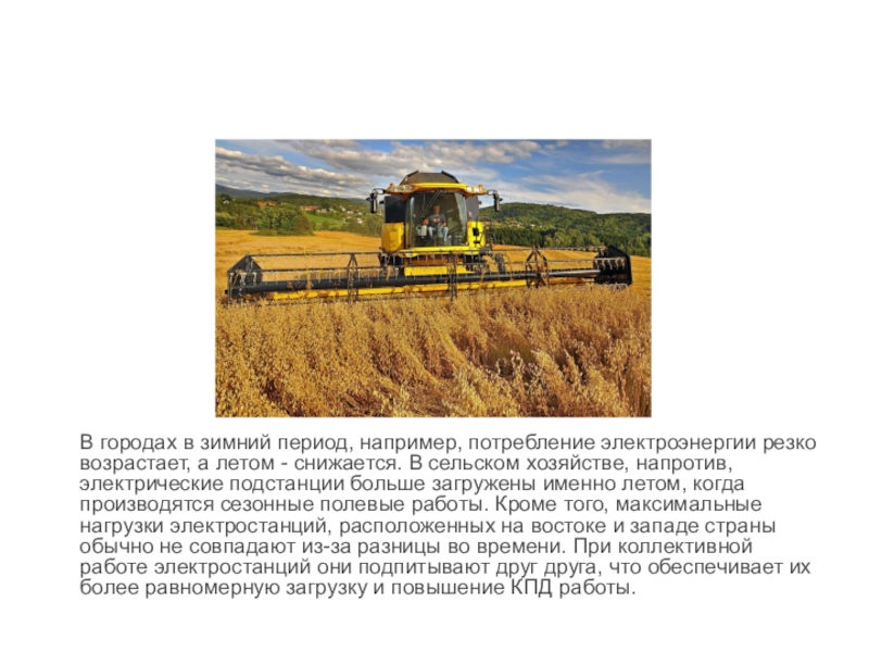 летом - снижается. В сельском хозяйстве, напротив, электрические подстанции больше загружены именно летом, когда производятся сезонные полевые работы. Кроме того, максимальные нагрузки электростанций, расположенных на востоке и западе страны обычно не совпадают из-за разницы во времени. При коллективной работе электростанций они подпитывают друг друга, что обеспечивает их более равномерную загрузку и повышение КПД работы.