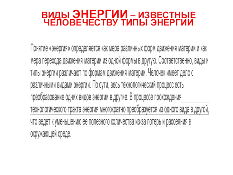 Слайд 11ВИДЫ ЭНЕРГИИ – ИЗВЕСТНЫЕ ЧЕЛОВЕЧЕСТВУ ТИПЫ ЭНЕРГИИ