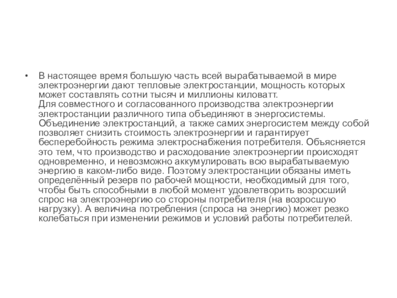 Для совместного и согласованного производства электроэнергии электростанции различного типа объединяют в энергосистемы. Объединение электростанций, а также самих энергосистем между собой позволяет снизить стоимость электроэнергии и гарантирует бесперебойность режима электроснабжения потребителя. Объясняется это тем, что производство и расходование электроэнергии происходят одновременно, и невозможно аккумулировать всю вырабатываемую энергию в каком-либо виде. Поэтому электростанции обязаны иметь определённый резерв по рабочей мощности, необходимый для того, чтобы быть способными в любой момент удовлетворить возросший спрос на электроэнергию со стороны потребителя (на возросшую нагрузку). А величина потребления (спроса на энергию) может резко колебаться при изменении режимов и условий работы потребителей.