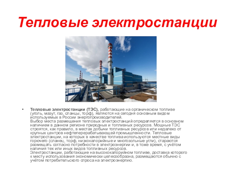 Выбор места размещения тепловых электростанций определяется в основном наличием в данном регионе природных и топливных ресурсов. Мощные ТЭС строятся, как правило, в местах добычи топливных ресурсов или недалеко от крупных центров нефтеперерабатывающей промышленности. Тепловые электростанции, на которых в качестве топлива используются местные виды горючего (сланец, торф, низкокалорийные и многозольные угли), стараются размещать согласно потребности в электроэнергии и, в тоже время, с учётом наличия тех или иных видов топливных ресурсов.