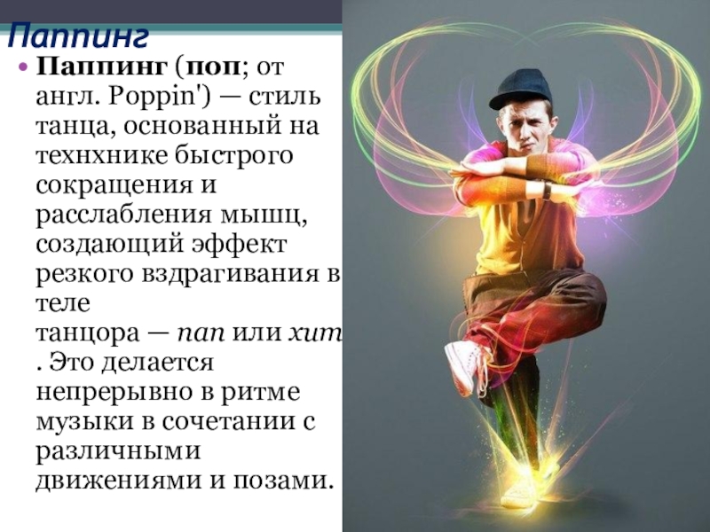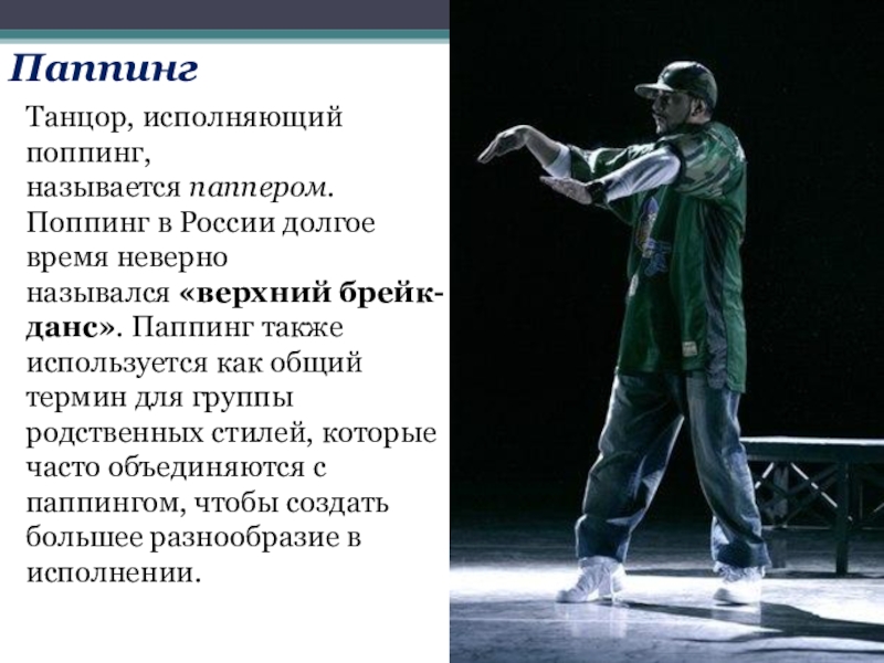Слайд 4Танцор, исполняющий поппинг, называется паппером. Поппинг в России долгое время неверно назывался «верхний брейк-данс».