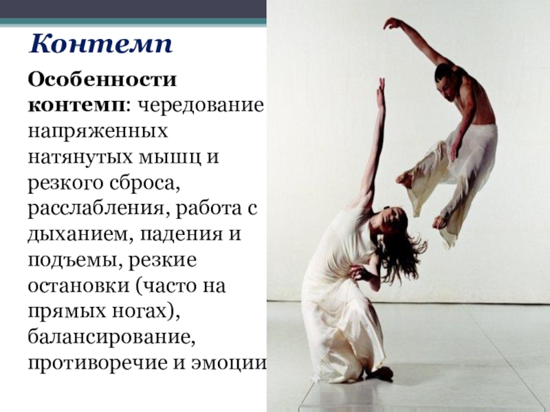 Особенности контемп: чередование напряженных натянутых мышц и резкого сброса, расслабления, работа
