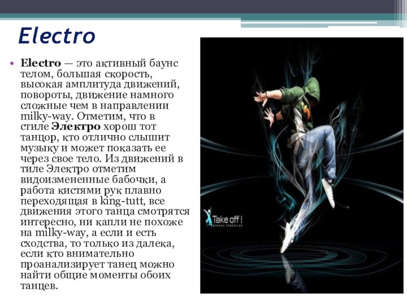 Electro — это активный баунс телом, большая скорость, высокая амплитуда движений, повороты,
