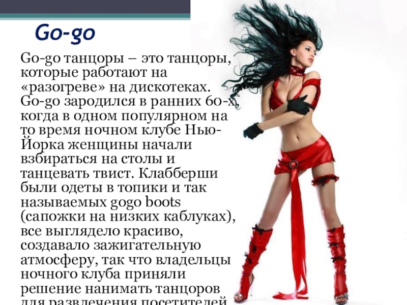 на дискотеках. Go-go зародился в ранних 60-x, когда в одном популярном на то время ночном клубе Нью-Йорка женщины начали взбираться на столы и танцевать твист. Клабберши были одеты в топики и так называемых gogo boots (сапожки на низких каблуках), все выглядело красиво, создавало зажигательную атмосферу, так что владельцы ночного клуба приняли решение нанимать танцоров для развлечения посетителей.