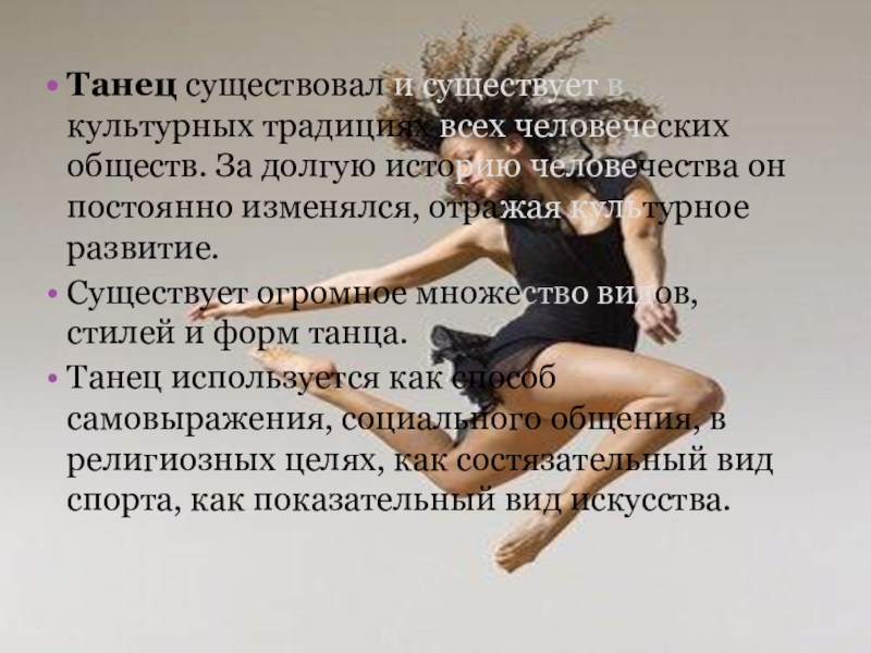 Слайд 2Танец существует столько, сколько существует само человечество. Он далеко не сразу