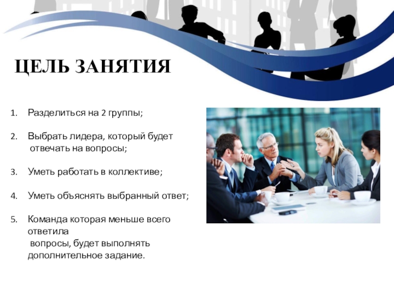Цель занятияРазделиться на 2 группы;Выбрать лидера, который будет отвечать на вопросы;Уметь работать в коллективе;Уметь объяснять выбранный ответ;Команда которая меньше всего ответила вопросы, будет выполнять дополнительное задание.