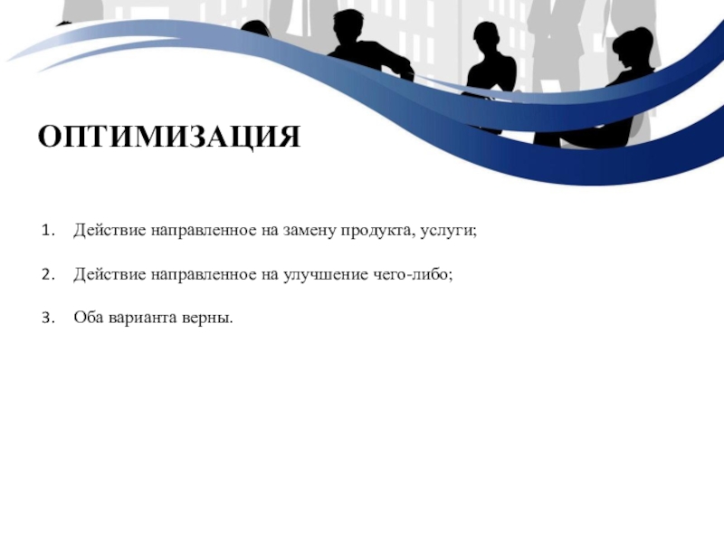 ОптимизацияДействие направленное на замену продукта, услуги;Действие направленное на улучшение чего-либо;Оба варианта верны.
