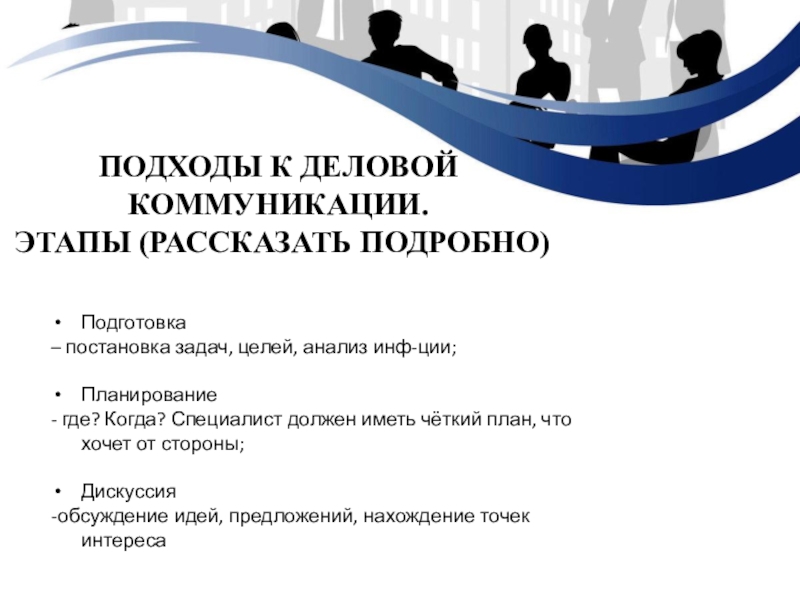 Подходы к деловой коммуникации.Этапы (рассказать подробно)Подготовка – постановка задач, целей, анализ инф-ции; Планирование- где? Когда? Специалист должен