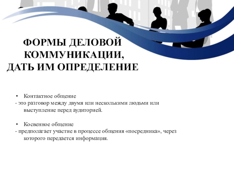 Формы деловой коммуникации, дать им определениеКонтактное общение- это разговор между двумя или несколькими людьми или выступление перед