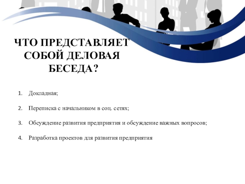 Что представляет собой деловая беседа?Докладная;Переписка с начальником в соц. сетях;Обсуждение развития предприятия и обсуждение важных вопросов;Разработка проектов
