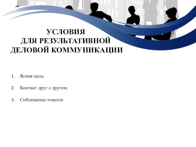 Условия для результативной деловой коммуникацииЯсная цель;Контакт друг с другом;Соблюдение этикета