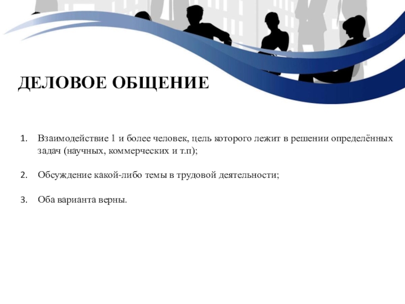 Деловое общениеВзаимодействие 1 и более человек, цель которого лежит в решении определённых  задач (научных, коммерческих и