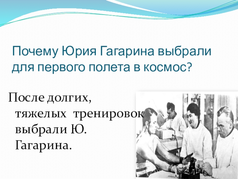 Слайд 4Почему Юрия Гагарина выбрали для первого полета в космос?