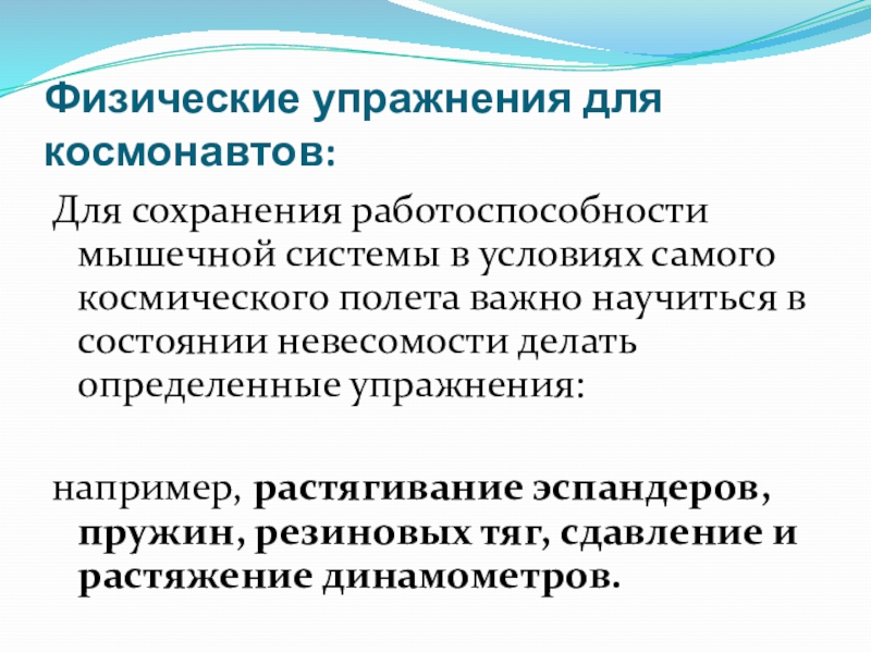 Физические упражнения для космонавтов:Для сохранения работоспособности мышечной системы в условиях самого космического полета важно научиться в состоянии