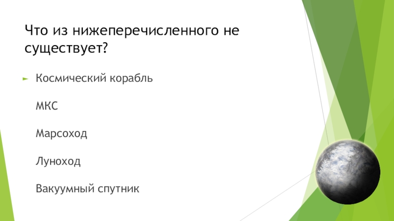 Что из нижеперечисленного не существует?Космический корабль  МКС  Марсоход  Луноход  Вакуумный спутник
