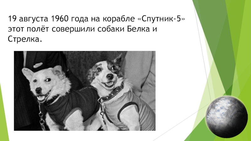 19 августа 1960 года на корабле «Спутник-5» этот полёт совершили собаки Белка и Стрелка.