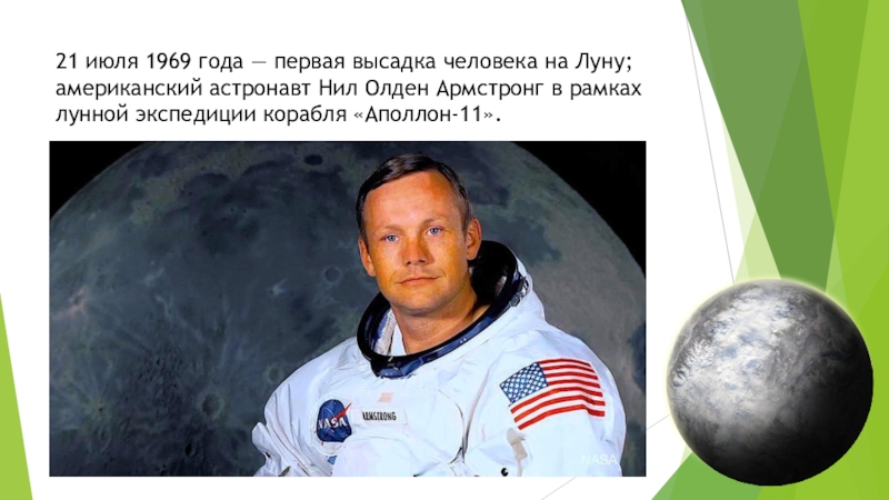 21 июля 1969 года — первая высадка человека на Луну; американский астронавт Нил Олден Армстронг в рамках