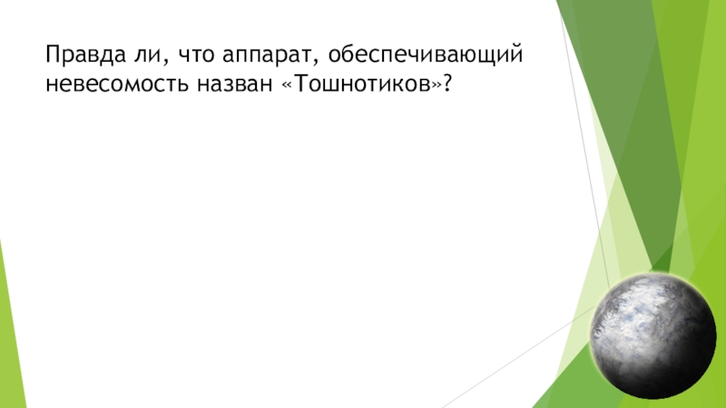 Слайд 30Правда ли, что аппарат, обеспечивающий невесомость назван «Тошнотиков»?