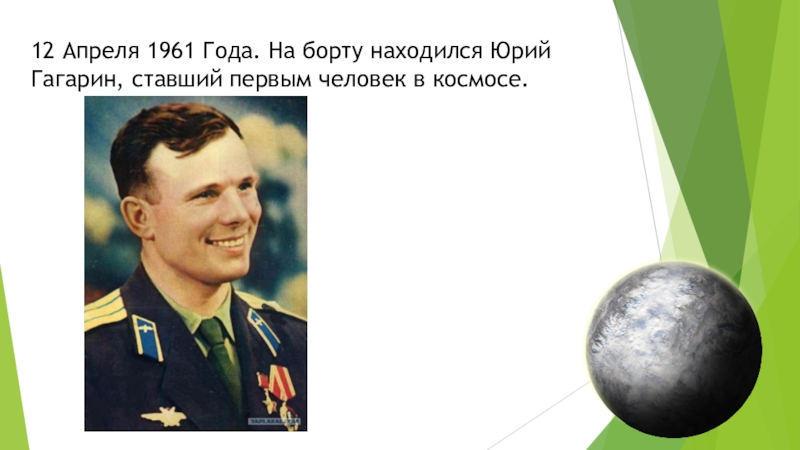 Слайд 1512 Апреля 1961 Года. На борту находился Юрий Гагарин, ставший первым