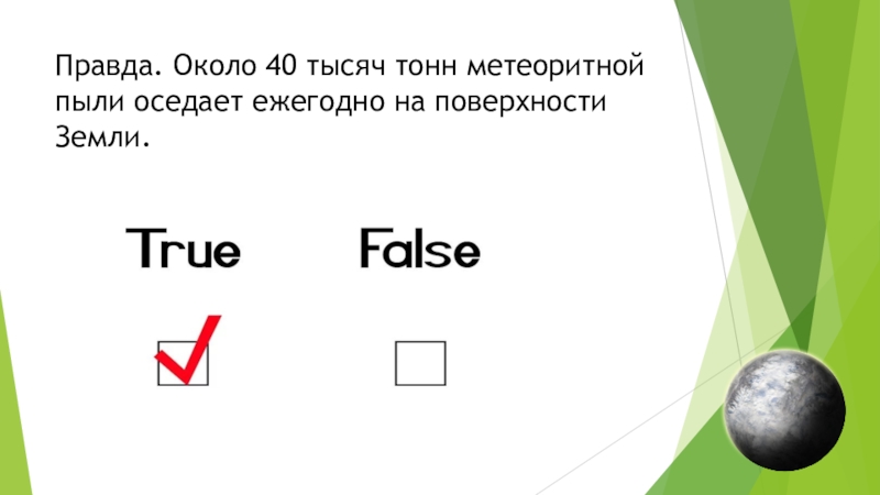 Слайд 39Правда. Около 40 тысяч тонн метеоритной пыли оседает ежегодно на поверхности