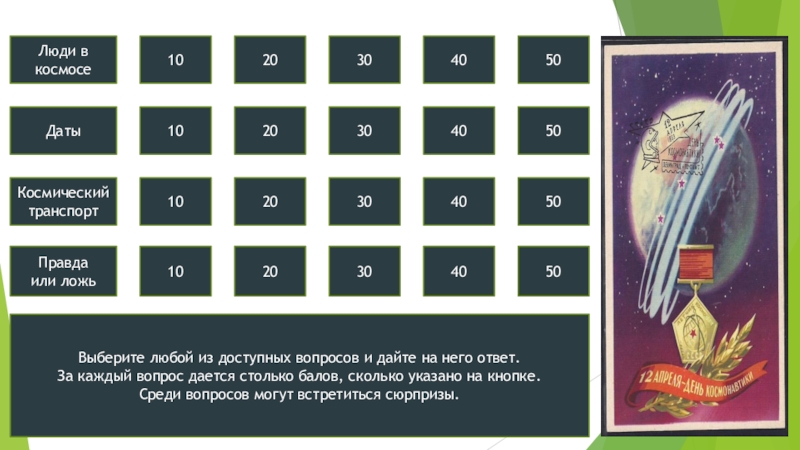 10Люди в космосе1020304050Даты1020304050Космический транспорт1020304050Правдаили ложь 1020304050Выберите любой из доступных вопросов и дайте на него ответ. За каждый