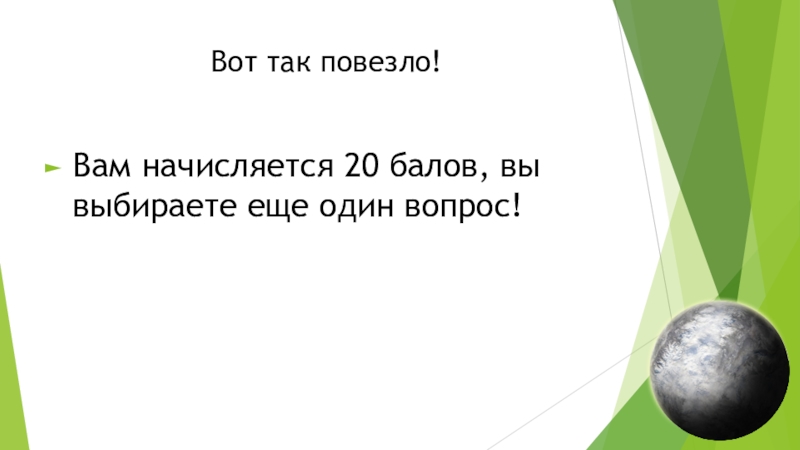 Вот так повезло!Вам начисляется 20 балов, вы выбираете еще один вопрос!