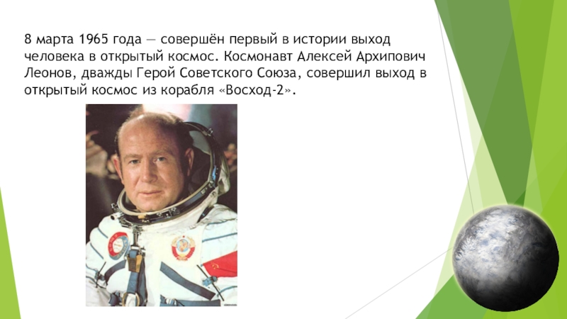 8 марта 1965 года — совершён первый в истории выход человека в открытый космос. Космонавт Алексей Архипович