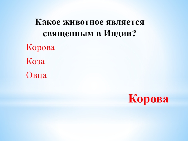 Корова Какое животное является священным в Индии?КороваКозаОвца
