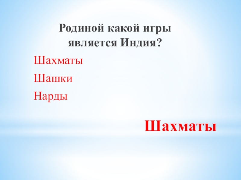 Шахматы Родиной какой игры является Индия?ШахматыШашкиНарды