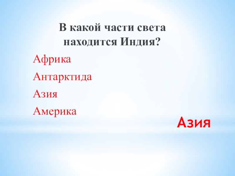 АзияВ какой части света находится Индия?АфрикаАнтарктидаАзияАмерика