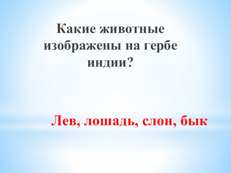 Лев, лошадь, слон, быкКакие животные изображены на гербе индии?