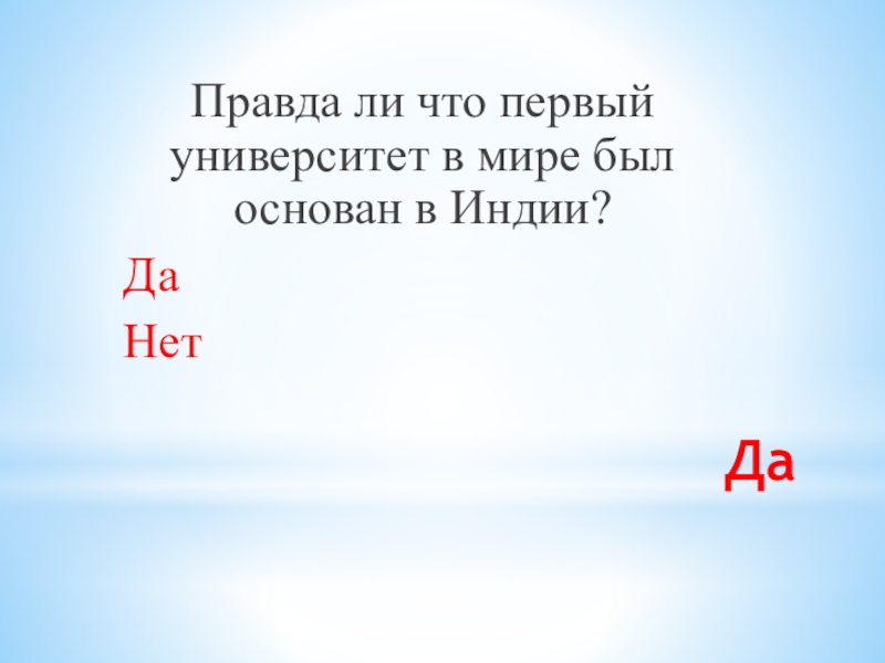 ДаПравда ли что первый университет в мире был основан в Индии?ДаНет